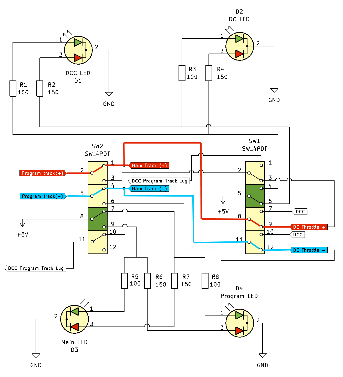 SW2 is thrown to Main and DC current is sent to both Main and Program tracks. The Main LED is green and Program is red.