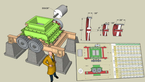 My design. Like I said before, based a lot on the top right one above. In the image to the left and up you see one of the rollers which is 30″ dia. If you look at the chart that’s the far right column. There are three different pullies shown. What size needed depends on the speed of the steam engine and the required speed of the breaker to operate efficiently. The width of the belt/flat pulley depends on how much HP is transmitted, how the belt is designed and so on.