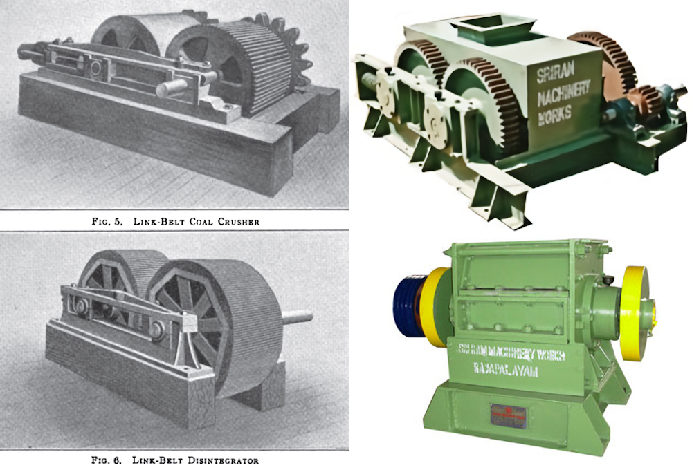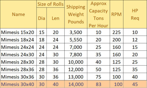 I found this chart on Google Books from an early 20th century book. It only went up to 30″ x 36″ rollers but that it 13,000 lbs. .. a pair? Not a problem for model railroaders but note the 40 hp requirement. I copied the chart into a spreadsheet to calculate for 30″x40″ rollers – honestly a mostly guess. That HO breaker with 54×76 rollers (meaning using this O scale model for HO) would need an engine over 280 HP. Simply scaling from O to HO .. 87.1/48=1.815 .. then 83×1.815=~150 tons per hour .. a bit much .. IMO.