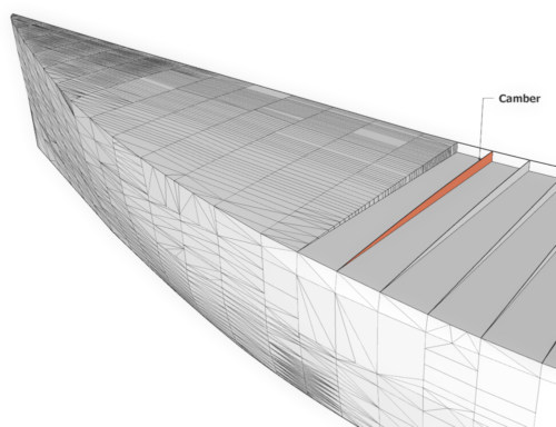 The image to the left shows the hidden lines, the actual structure of the model. I have a bit of the deck curve shown .. the deck Camber. From Wikipedia .. “The camber is a measure of lateral main deck curvature in naval architecture. The curve is applied to a deck transversely, measured as the height of deck at centreline above the height of deck at side.” This allows water to run off and is approximately 1/50 of the beam/transverse of the ship at that point.
