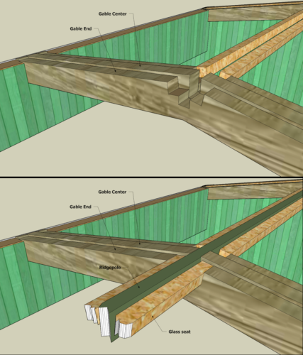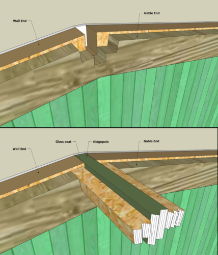 This is a look at how the Ridgepole and Glass Seats fit. The O scale 2×4 Ridgepole fits into a slot in both the Wall End and the Gable End pieces. The Laserboard overlay hides the end of the piece of wood.