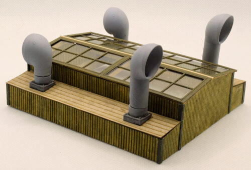 Here I am test fitting the O scale 2×4 Ridgepole which runs the length of the Skylight fitting into slots in the gables. It stops against the end walls just shy of the Laserboard overlays.