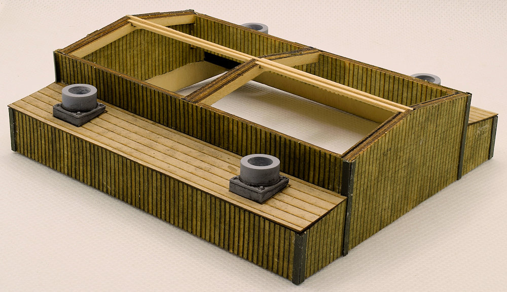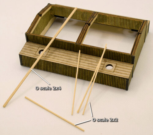 The O scale 1×4 Ridgepole stretches the length of the model while the O scale 2×2 run from the ends to the center.