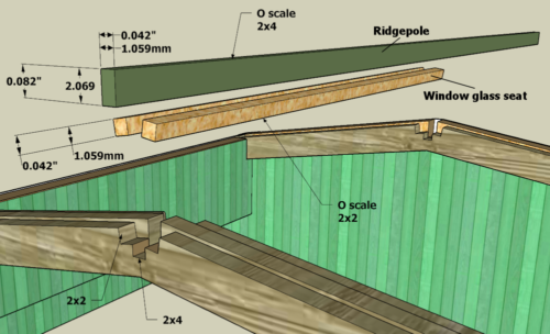 • I placed an O scale 2×2 on top of the ridgepole. When I added the Pocket Framing for the 0.005″ clear styrene it raised everything up a bit. I will paint that green to match the other trim etc.