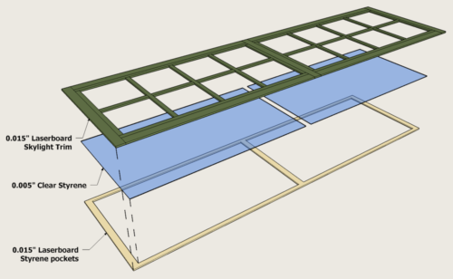 The topmost section is the trim and all the window framing – stiles, muntins, rails etc. I could etch all the “joints” in the 0.015″ Laserboard. I then made a frame to act as pockets for the “glass” .. the same outside dimensions as the trim. The 0.005″ clear styrene could then be glued .. very carefully .. into the pockets.
