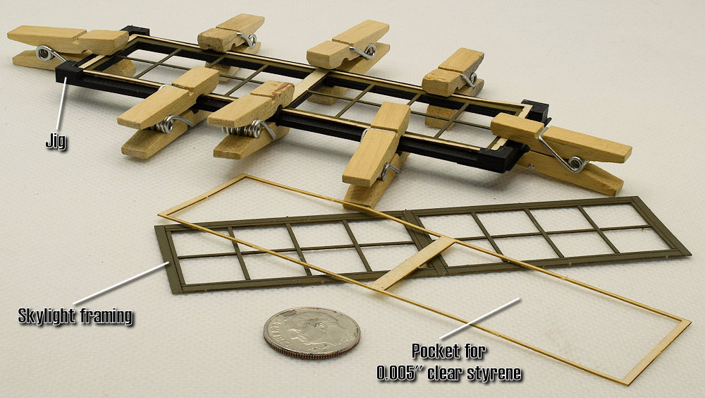 I printed a jig to hold the Skylight Framing and the Pocket Framing aligned while gluing up. I brushed white glue across the face of the Pocket Frame with a Horsehair Bristle Acid Brush I got from Harbor Freight – 36 ea for $3 so only .50¢ each .. nice sturdy brushes you can use and toss.